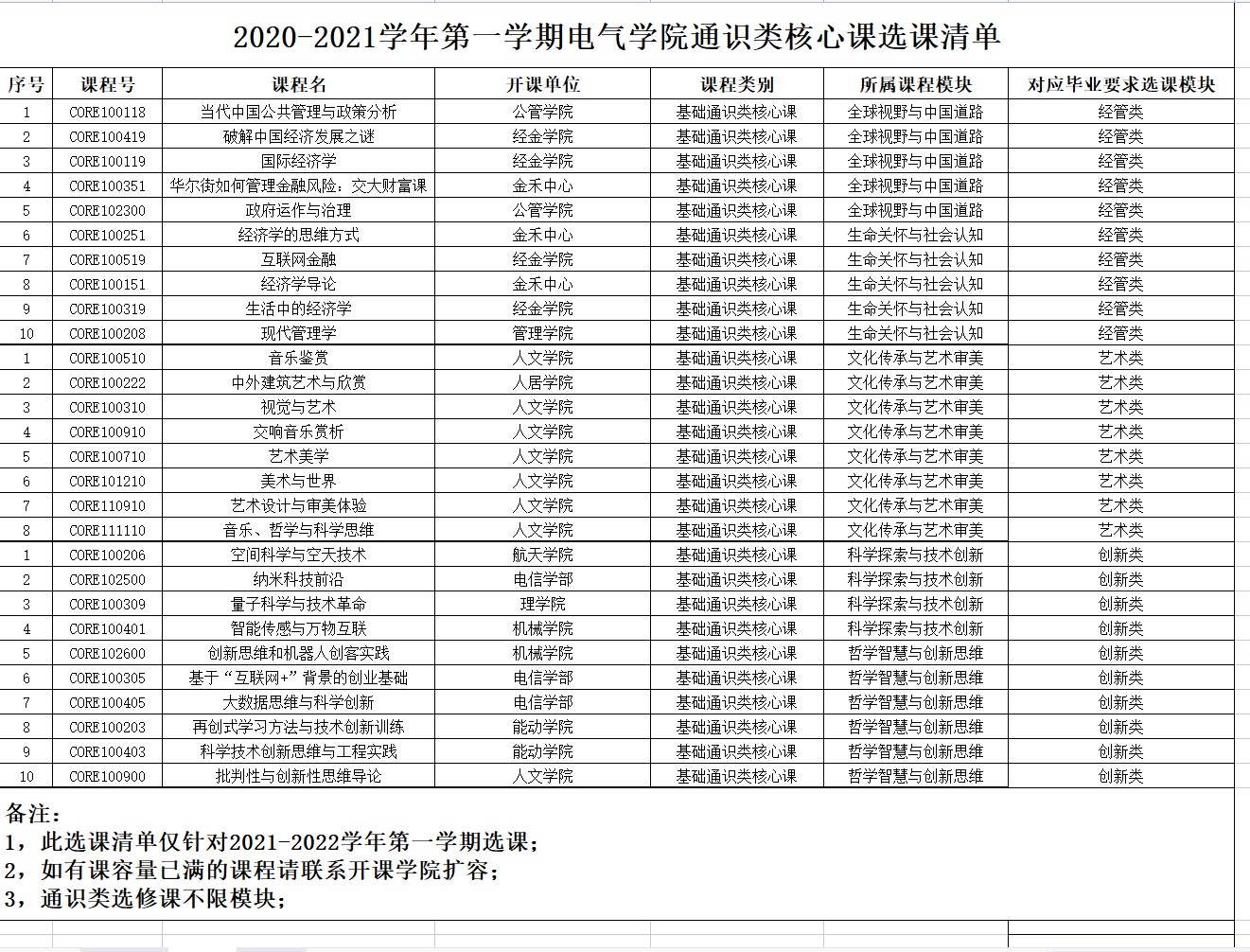 1,电气学院培养方案及毕业要求中规定学生大四毕业前完成通识类核心课6学分,其中在经管类、艺术类、创新类三类中各选2学分;
