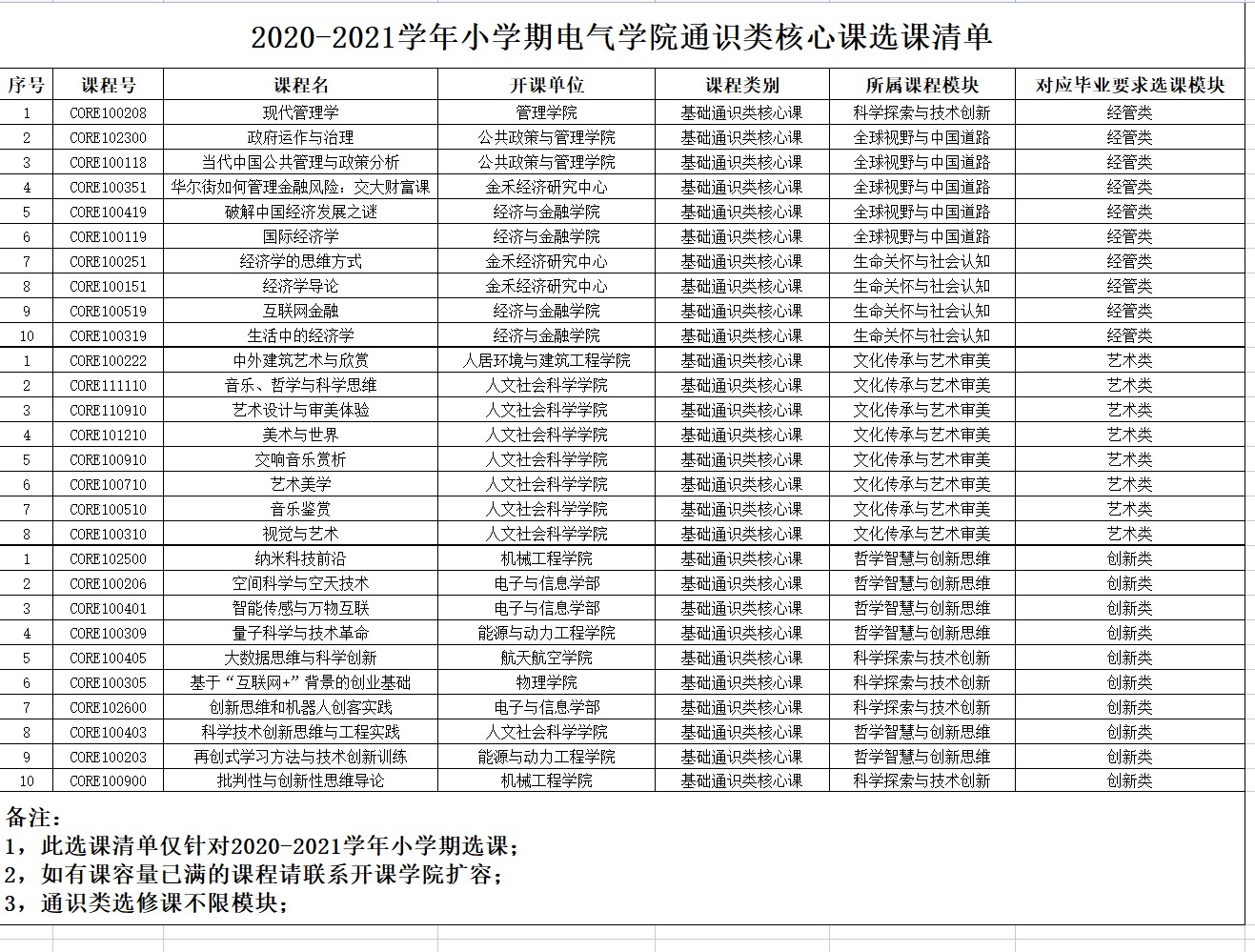 1,电气学院培养方案及毕业要求中规定学生大四毕业前完成通识类核心课6学分,其中在经管类、艺术类、创新类三类中各选2学分;