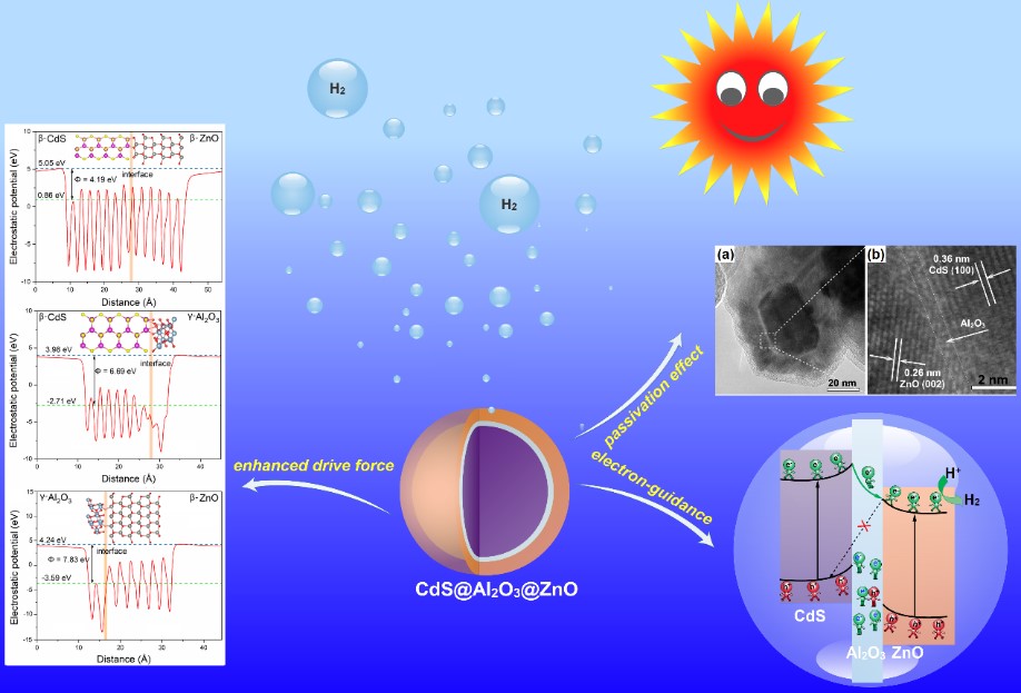 电气学院电力设备电气绝缘国家重点实验室新型储能与能量转换纳米材料研究中心,在CdS@ZnO核壳异质结催化剂(Nano Energy39 (2017) 183−191)的前期工作基础上,通过原子层沉积在CdS和ZnO之间引入具有良好表面相容性的超薄Al2O3钝化层,得到CdS@Al2O3@ZnO核壳异质结催化剂,其光催化产氢性能从CdS@ZnO的70.47 mmol/g/h提高到101.3 mmol/g/h。实验和理论计算结果表明,超薄Al2O3层不仅有效钝化了CdS与ZnO之间的界面缺陷,而且将CdS与ZnO之间的载流子传输机制从直接Z型转变为类似II型,产氢反应位点从CdS@ZnO催化剂的CdS核表面转移到CdS@Al2O3@ZnO催化剂的壳表面,从而显著提升光催化产氢性能。该项工作表明可以通过异质结界面调控促使载流子迁移机制向有利于光催化反应的方向,为提高异质结催化剂的光催化产氢性能提供了一条新的路径。