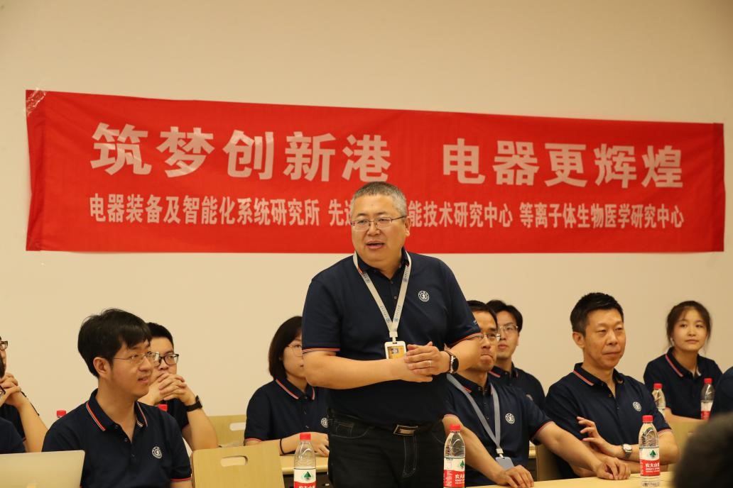电器教研室在创新港正式开启了协同创新、砥砺奋进的崭新征程,原电器教研室主任、电器装备及智能化系统研究所负责人耿英三教授表示了深切期待。他从教研室徽标的诞生历史讲起,希望广大师生继续延续徽标内涵的专业化核心技术、国际化深入交流和万物互联的核心精神,把握传统优势方向,开拓创新新局面。在创新港大平台的基础上,继承以和为本的大团队思想,产出服务国家、服务社会的大成果,开创学科发展的辉煌局面。