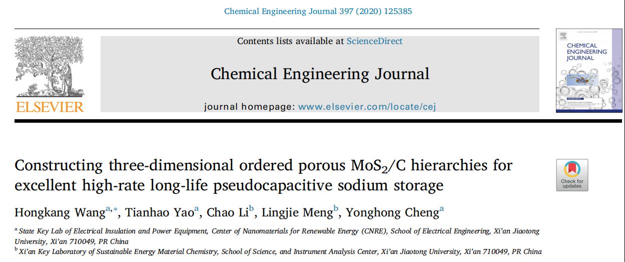 王红康副教授课题组采用模板结合纳米铸造(Nanocasting) 的方法,成功设计并构筑了由超薄MoS2/C中空/多孔球相互交联形成的三维等级结构。借助模板剂(均一氧化硅球)的引入并去除,实现了电极材料的三维多孔等级构筑,避免了材料堆叠团聚,提高了电解液-电极界面接触性能。碳源的引入,使得MoS2(002)晶面层间距显著增加,同时提高了材料的结构稳定性和导电性。作为钠离子电池材料,该电极实现了结构稳定性、导电性和界面接触性能的有机结合,表现出了优异的储钠容量、循环稳定性和高倍率性能,在2A/g大电流密度下循环500圈容量仍能保持412mAh/g(高于锂电池石墨负极的理论比容量372mAh/g),甚至在10、20和50A/g大电流密度下循环5000圈,容量仍能分别保持在156、128和76mAh/g(目前常用钠电正极Na3V2(PO4)3和NaFePO4的理论分别为~118和154mAh/g)。该材料表现出了优异的赝电容储钠性能,对于开发兼具高能量密度和高功率密度的赝电容储能设备(如钠离子电容器)具有重要的指导意义。该研究工作以“Constructing Three-Dimensional Ordered Porous MoS2/C Hierarchies for Excellent High-Rate Long-Life Pseudocapacitive Sodium Storage(构筑三维有序多孔MoS2/C等级结构实现优异高倍率长寿面赝电容储钠性能)”为题,发表在国际化学工程领域top期刊Chemical Engineering Journal (化学工程,影响因子10.652),快看漫画