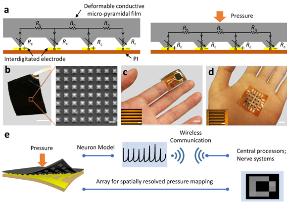 李盛涛教授课题组联合美国加州大学洛杉矶分校Prof. Yu Huang(黄昱教授)和Prof. Xiangfeng Duan(段镶锋教授)课题组报道了基于具有微金字塔结构的PDMS/CNT(聚二甲基硅氧烷/碳纳米管)导电复合材料高性能柔性电阻式压力传感器的简单直接的设计方法。基于传感器的工作机理,从电路模型(路)和有限元数值仿真(场)两方面,揭示了与以往的设计——微金字塔表面涂覆很薄的导电层相比,该设计方法可提供更宽的压力量程和更高的灵敏度。结合数值仿真和实验结果揭示了传感器的压力响应取决于其间距与基底长度之比,而不仅仅依赖于间距,且当间距与基底长度为1:1时,可获得优异的综合性能以模拟SA-I机械感受器,该优化设计比例的压力传感器可在小压力范围和中等压力范围下提供高灵敏度、快速响应时间、高力学稳定性、低工作电压和低功耗,高线性度和低滞回以及微米尺度高度均一的优异综合性能。基于该优化设计比例的传感器,构建了可实时地将幅值信号转化为频率信号且进行无线传输的压力传感系统,以及可实时地进行空间分辨的压力传感阵列平台。此外,鉴于微金字塔结构的广泛应用,基于导电复合材料的微金字塔结构也可被集成到电容式、晶体管式、摩擦电式等其他类型的传感器以获取高的机械稳定性。