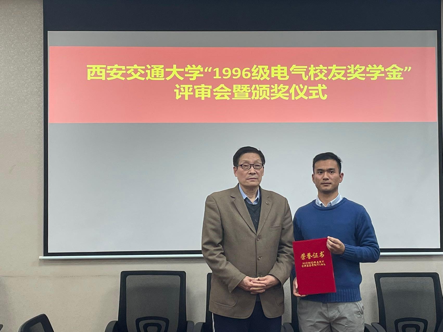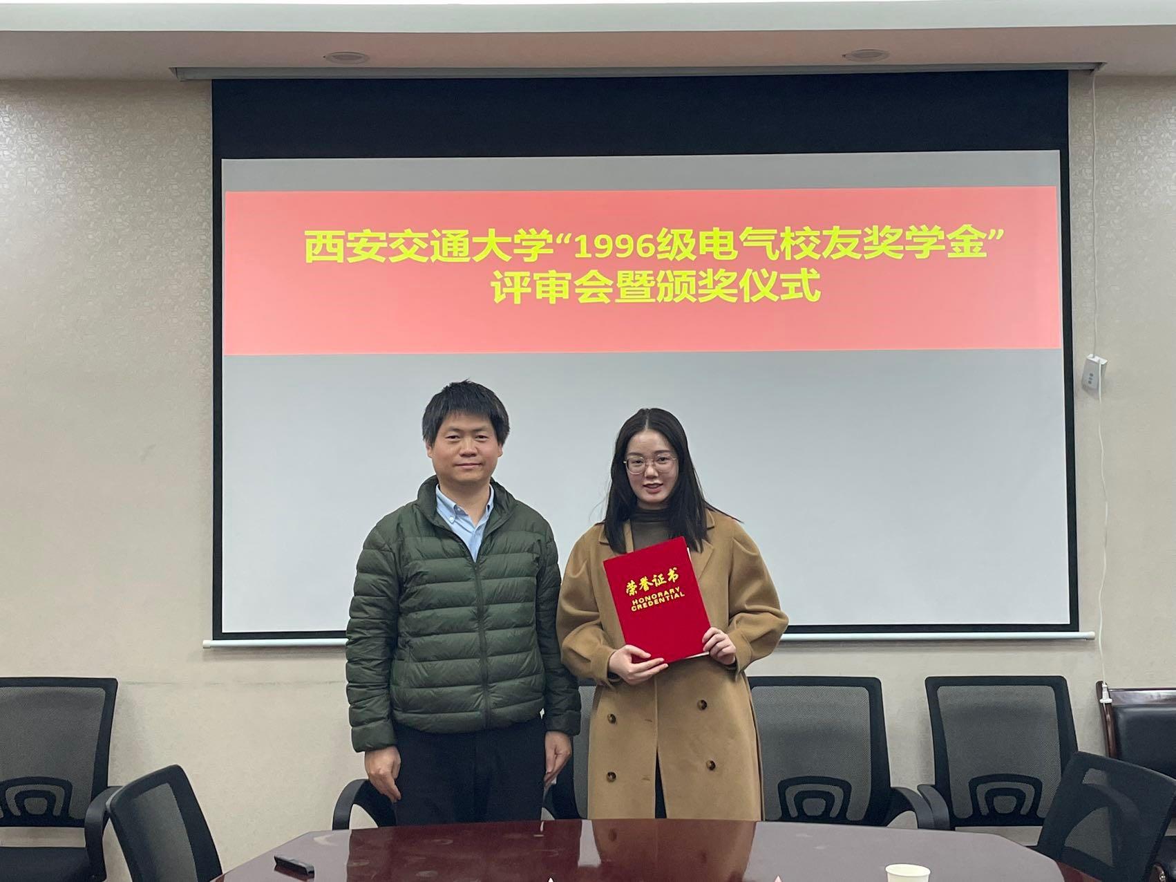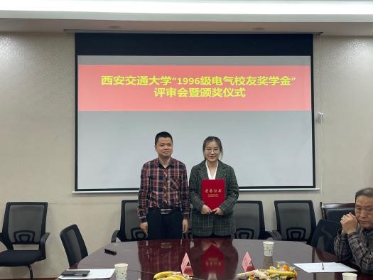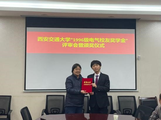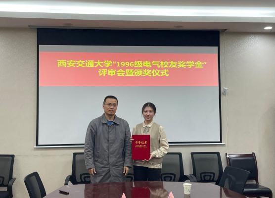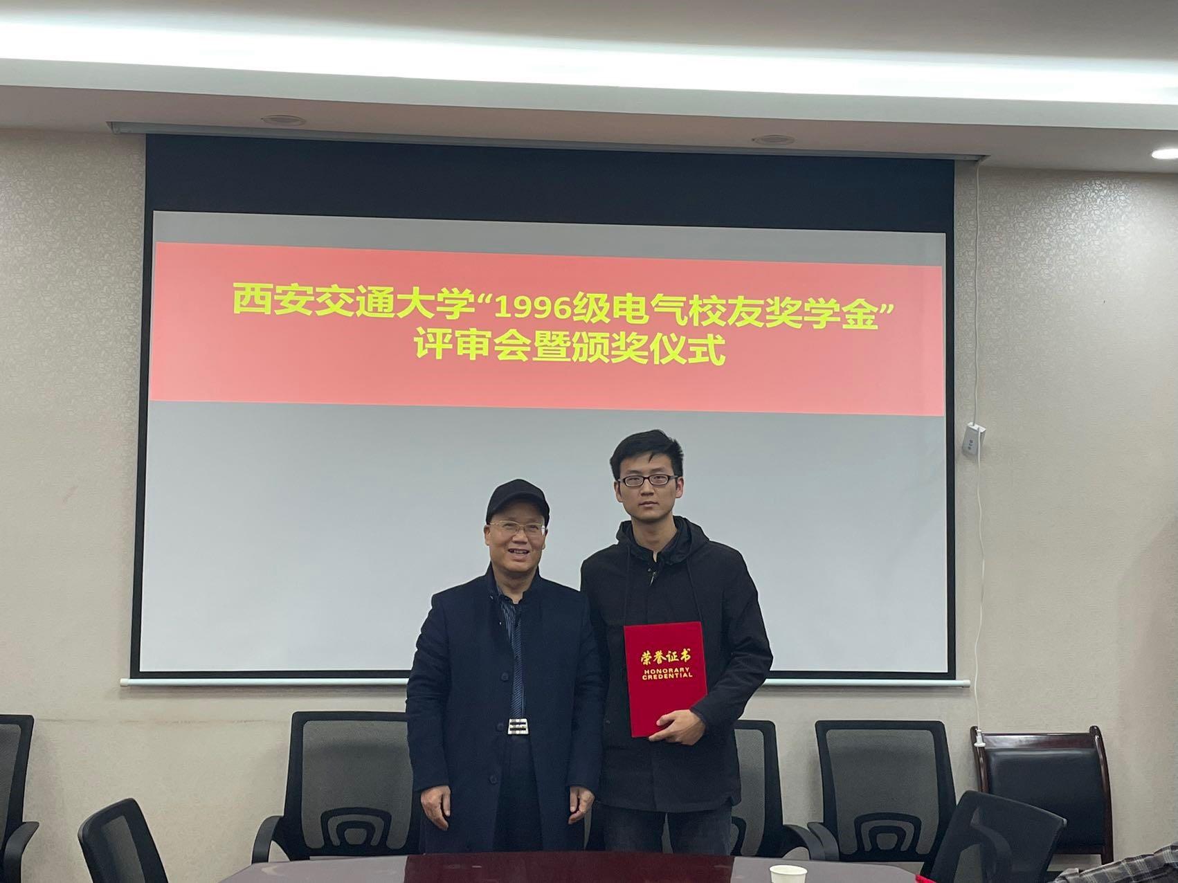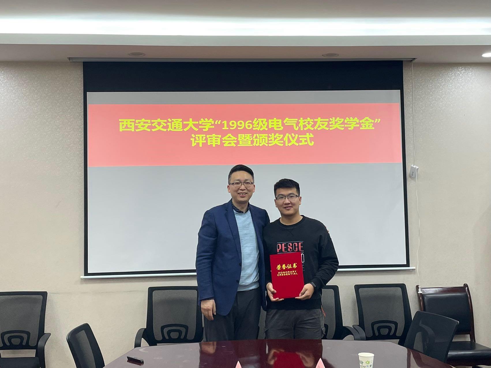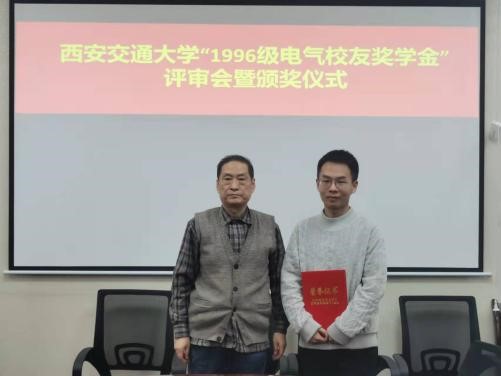 “1996级电气校友奖学金”由电气学院1996级校友集体捐赠和募集,该奖学金每年评选一次,今年是第二次颁发。用以鼓励电气学院品行端正、成绩优秀的学生,其奖励标准为研究生每人4000元,本奖学金与其他奖学金不可兼得。