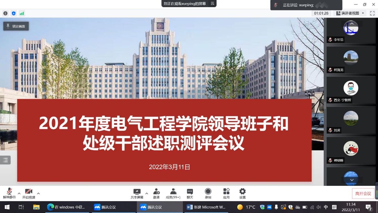 3月11日,电气学院召开2021年度领导班子和处级干部述职测评大会,全院教职员工线上线下共同参加,会议由党委书记梁得亮主持。