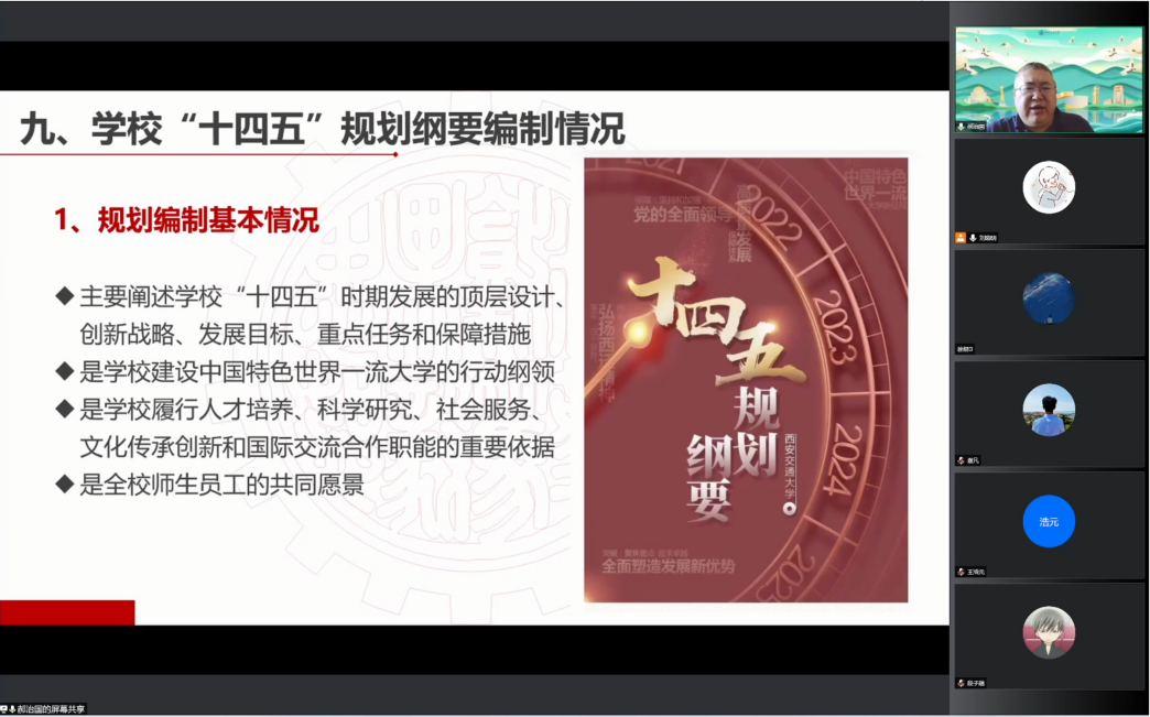 郝治国重点解读了学校第十三次党代会党委工作报告的主要内容,报告全面总结和回顾了学校第十二次党代会以来主要工作和成绩,特别是把西迁精神写到了中国共产党人精神谱系中以及创新港的建设两大标志性成果,各位党员更深刻地认识到学校发展的突出成效,这正是一代代交大人传承西迁精神、矢志拼搏奋斗的生动写照。报告明确了今后五年的奋斗目标和总体要求、学校高质量发展面临的形势与任务。当前百年未有之大变局加速演变,大国博弈日趋激烈,新冠疫情影响广泛深远,经济全球化遭遇逆流,在此背景下学校高质量发展担负重要使命,在合作创新中培养高层次创新人才,加快融入经济社会发展。为落实今后五年的奋斗目标和总体要求,学校总结了当前存在的不足,制定了2035、2050中长期发展规划。“道阻且长,行则将至”,为实现发展目标,接下来的五年非常关键,郝治国勉励身处这一进程中的各位博士生党员胸怀国之大者、弘扬西迁精神、勇担国家使命、共创交大荣誉,为加快建设中国特色世界一流大学努力奋斗。