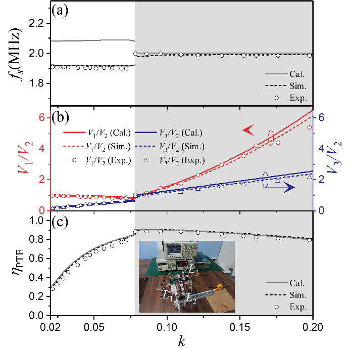 电气学院先进电磁调控与能量转换技术研究中心(CAEMEC)马西奎教授团队董天宇副教授和邹建龙副教授等通过开展互感耦合多线圈系统和非线性电路的理论研究,发现并提出一种新的理论方案——在三线圈互感耦合谐振电路系统中,利用非线性放大器的自适应增益特性,实现在变化互感耦合参数下的定频高效无线电能传输。该方案指出:在合理的增益损耗参数下,谐振电路系统无需满足宇称时间对称也能稳定高效运行。研究进一步放宽了对系统增益模块电路配置的要求,从而为动态无线电能传输系统以及基于互感耦合谐振电路的其他应用技术提供了极为广阔的设计自由度。该理论框架支持拓展到多源或多负载的系统架构,为实用化的多目标无线电能传输甚至组网技术提供了新的途径,有助于减少诸如电动汽车等移动用电设备对电池的依赖,助力“双碳”目标实现。基于该理论,研究团队构建出一种双发射机单接收机架构的伪厄米无线电能传输系统,并通过实验证实:在强耦合区域内,即使传输距离发生变化,该系统在无需任何主动调节的情况下仍可以实现定频鲁棒无线电能传输;此外,系统能在无线电能传输的同时实现电压等级调控。这种基于非厄米物理的设计方案为推动实用化动态无线电能传输技术提供了强有力的理论支撑,具有广泛的科学价值与应用前景。