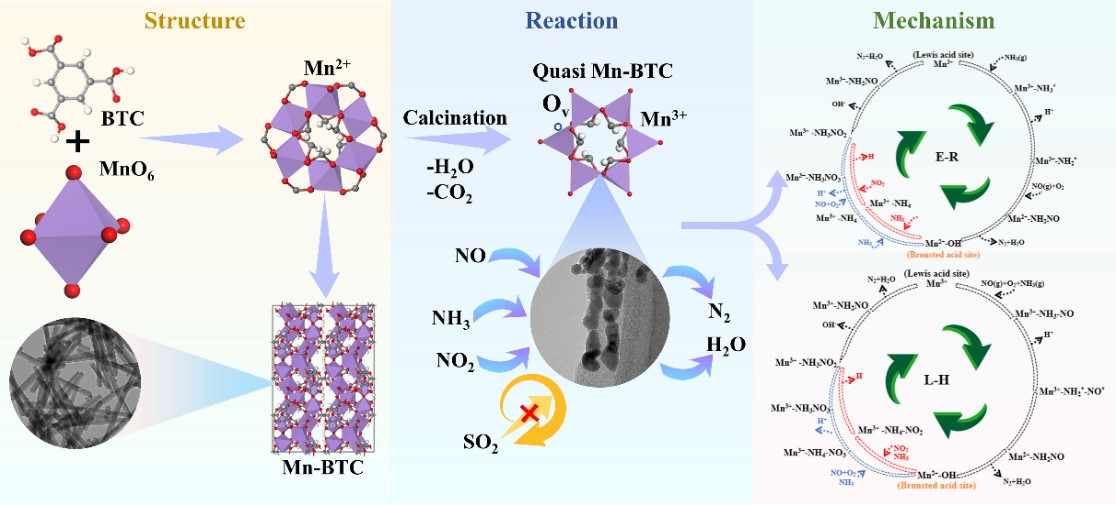 电气学院、电力设备电气绝缘国家重点实验室新型储能与能量转换纳米材料研究中心,研制了一种新型脱硝催化剂quasi-Mn-BTC。该催化剂是介于金属有机框架和金属氧化物之间的一种过渡态,具有丰富的氧空位、独特的分级多孔结构和半金属特性,抗硫性能优异。该催化剂活性位点和二氧化硫之间电子传输不易发生,因此二氧化硫难以在活性位点上发生吸附和反应;同时,独特的分级多孔结构使催化材料选择性吸附氨和氮氧化物,不吸附二氧化硫,从而避免二氧化硫与氨和氮氧化物之间的竞争吸附,提升了催化剂的抗硫性。该研究突破了锰基低温脱硝催化剂抗硫性差这一瓶颈,揭示了其抗硫性能优异的内在原因,为提高锰基催化剂抗硫性能提供了新的思路。