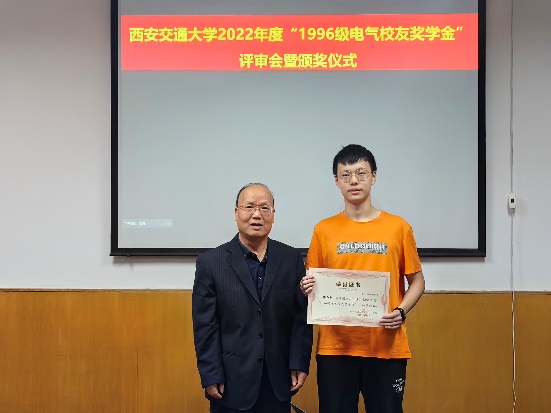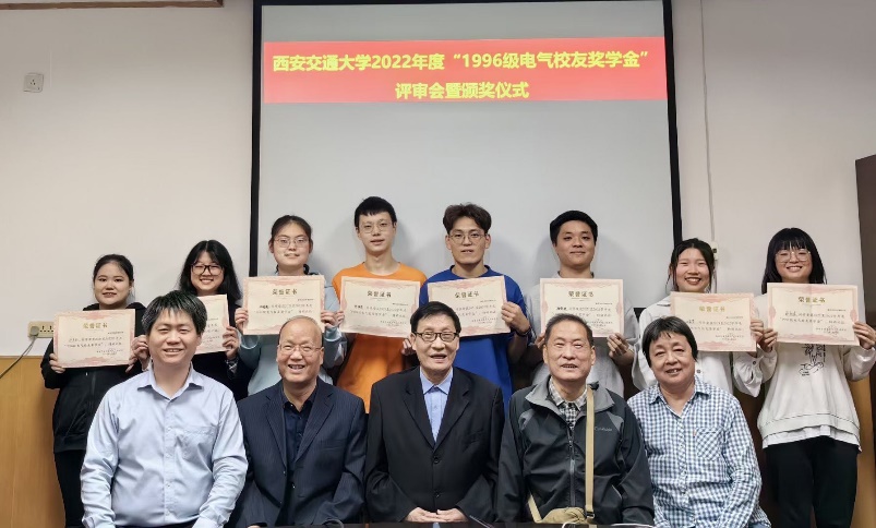 2023年5月24日,电气学院召开“1996级电气校友奖学金”评审会暨颁奖仪式,评审委员会主席阎治安教授、委员张彦斌教授、刘崇新教授、王仲奕教授、96级电气校友段成刚(华为技术有限公司)、96级电气校友许爱东(南方电网科学研究院)、96级电气校友刘江生(上海艾飞能源科技有限公司),“1996级电气校友奖学金“管理委员会主任、电气学院党委副书记宋杰老师、管理委员会副主任陈玉老师出席会议。评审委员会根据申请人学习情况,创新能力,综合素质,社会实践表现综合评定,最终评选出发电、电机、绝缘、电器、三电、工企、高压方向各1名,共计7名三年级本科生,授予2022年度“1996级电气校友奖学金”。