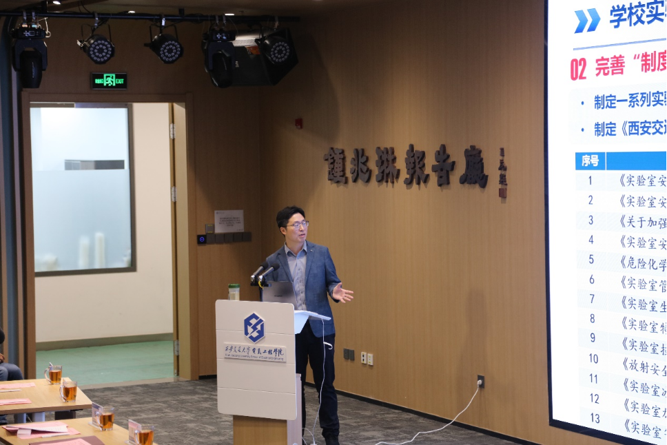 实验室管理处副处长徐四龙介绍了本次安全月活动的具体内容。徐四龙首先介绍了学校实验室安全管理体系,通过责任链、制度链、监督链、保障链、教育链“五链融合”,筑牢实验室安全防线。随后,徐四龙介绍了本次实验室安全月包含安全大讲堂、实验室安全知识与典型安全事故案例巡展、实验室安全知识竞赛、实验室安全公益广告创作大赛、实验室安全建设先进工作评比、学院(部、中心)安全月活动在内的六大主题活动具体内容,并表示欢迎同学们积极参加本次活动月的相关活动。