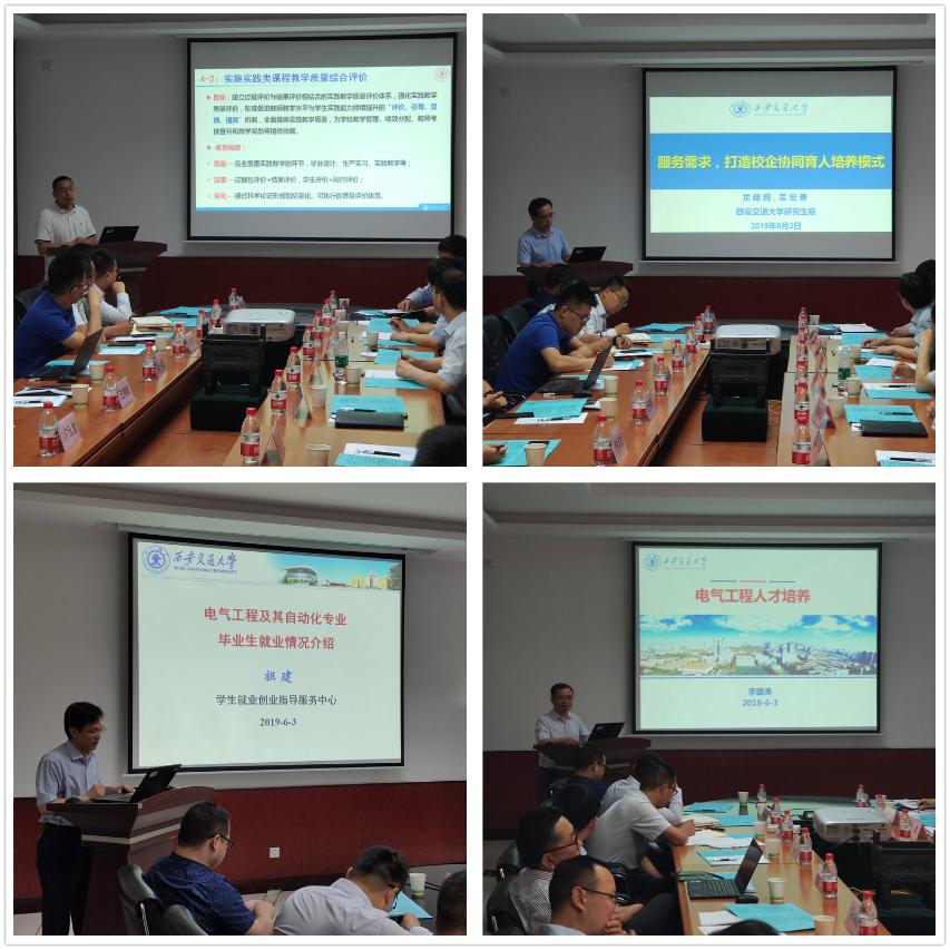 会中,实践教学中心徐亮副主任、研究生院龙建纲副院长、就业创业指导服务中心副主任祖建分别从学校实践教学体系构建、工程研究生培养模式、电气工程专业毕业生就业情况三个方向进行了汇报。李盛涛常务副院长详细介绍了电气学院人才培养目标及模式。