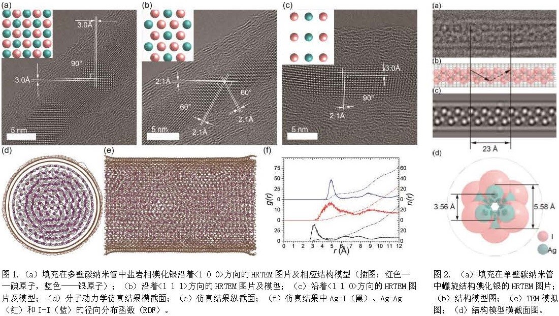 电气学院新型储能与能量转换纳米材料研究中心的研究团队通过引入碳纳米管作为反应容器和生长模板,利用碳纳米管内腔的尺寸效应和特殊物理化学环境,合成了碘化银的高压相盐岩相碘化银(存在于400MPa-11.3GPa)以及另一种新型的螺旋状介稳态碘化银结构;并且将这两种结构成功稳定于室温室压条件下。一方面,在反应过程中碳纳米管的特殊纳米空间能够为材料提供一个受管壁与材料本身性质共同调控的压强;另一方面,碳纳米管的管壁又将合成产物与周围环境分隔,并继续对产物产生压力作用和尺寸效应。这样,合成的介稳态结构便室温室压条件下稳定存在下来。这一技术手段为极端结构或者特殊性能介稳态结构的合成与应用提供了新的思路。