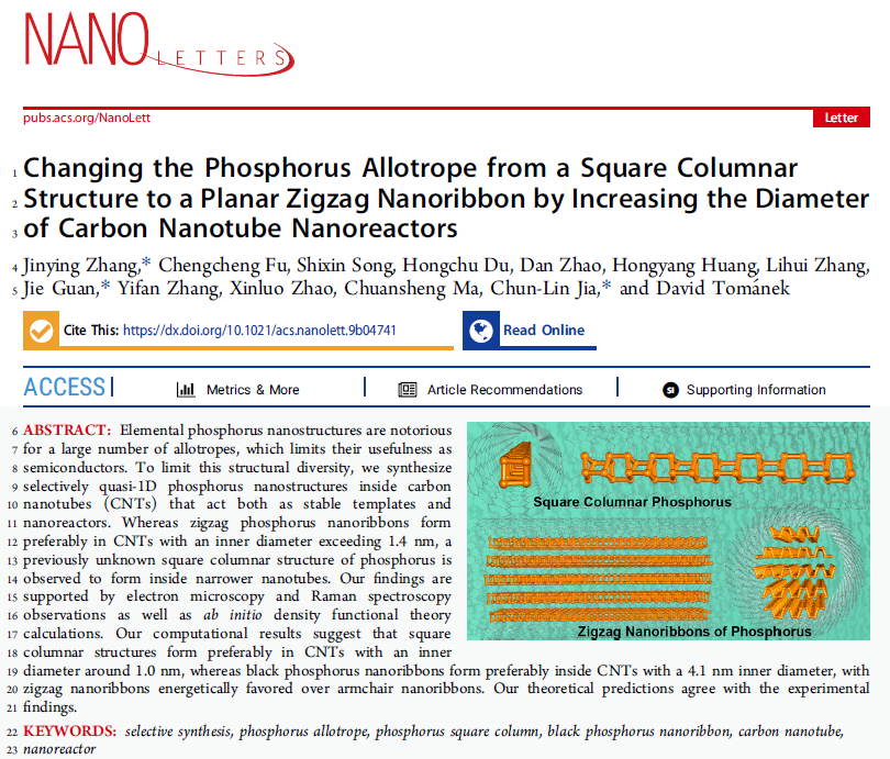 贾春林科学家工作室、东南大学、上海大学和密西根州立大学合作,利用不同内径的碳纳米管作为特殊反应腔可控合成不同的磷的同素异形体结构。在内径约为1.0纳米的碳纳米管内合成新的方形柱状磷结构,而在内径约为4.1纳米的多壁碳纳米管内合成之字型走向的黑磷纳米片结构。该实验结果与我们的理论预测完全吻合,理论预测当截面尺寸小于1.4纳米时,方柱状磷结构是最稳定的,而当截面尺寸大于1.4纳米时,之字型走向的黑磷纳米片结构是最稳定的。相关成果以《增大碳纳米管反应器的直径使方柱状磷结构到之字型走向的黑磷纳米片》“Changing the Phosphorus Allotrope from a Square Columnar Structure to a Planar Zigzag Nanoribbon by Increasing the Diameter of Carbon Nanotube Nanoreactors”为题发表在纳米材料领域顶级期刊《纳米快报》上(影响因子12.279)。快看漫画