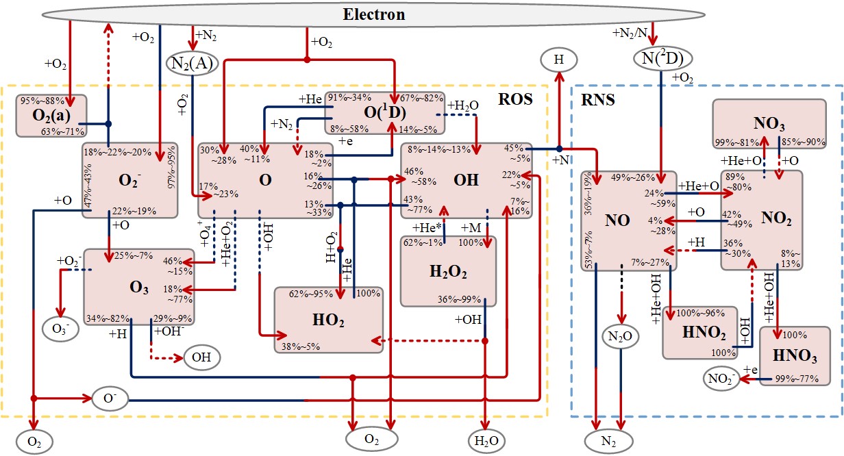 进行推荐。该论文建立了氦气中掺杂空气的等离子体一维流体仿真模型,揭示了空气掺杂对放电特性与活性粒子的影响规律,绘制了等离子体中活性粒子的反应图谱(如下图所示)。研究发现等离子体中活性氧粒子和活性氮粒子的反应体系相对独立,二者的主要关联是OH氧化N产生NO。美国物理学会《科学之光》栏目(AIP Scilight)专访了本文的通讯作者刘定新教授,并以 “Simulations demonstrate how reactive species are produced by cold atmospheric plasmas”为题进行了报道。