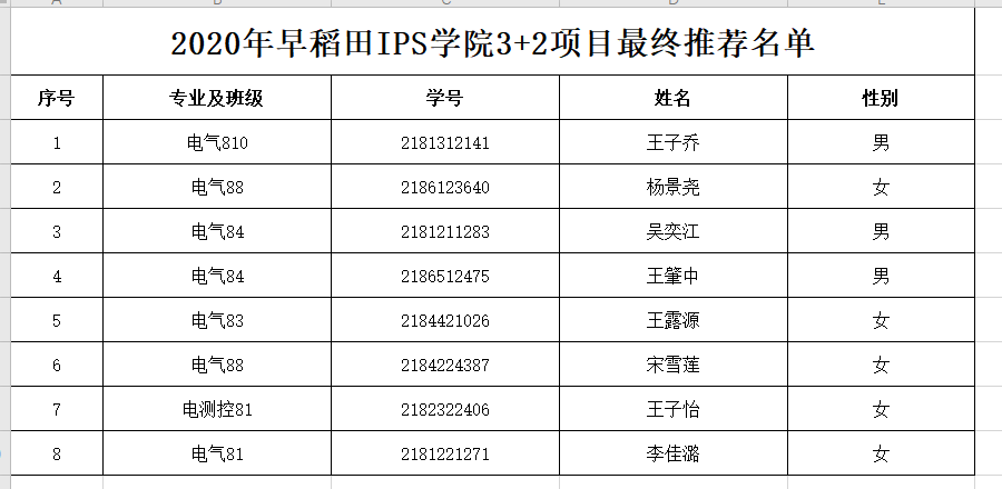 2020年电气学院-日本早稻田IPS学院“3+2”项目最终推荐名单公示如下,公示期为7天,如有问题请于11月22日之前反馈给电气学院本科教务李睿洁,联系电话82668632,邮箱jayrey[email protected]。