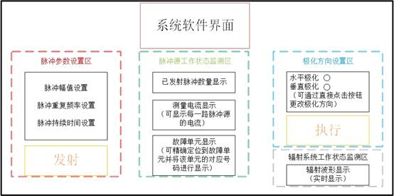 工控机上软件界面如图2所示。可直接设置如脉冲重复频率、脉冲个数、脉冲幅值和脉冲时长等参数并通过TTL数据线将参数传输至触发脉冲源。当辐射系统工作时,还可实现脉冲计数功能,记录已发射脉冲的数量。具有故障检测报警功能,通过实时检测各个独立单元工作时的电流参数,判断其工作是否出现异常,当某一脉冲源单元工作异常时,能够及时通过电流异常触发报警信号,从而及时发现并定位故障单元。具有极化方向控制功能,工控机通过光纤直接与系统电机相连,点击软件按钮可直接控制电机工作从而改变系统的极化方向,可实现水平极化和垂直极化的切换。可以实时监测辐射系统工作情况,工控机通过光纤与示波器相连,将测量天线测量得到的实时辐射波形直接显示在软件上。软件界面清晰明了,交互简洁不繁琐,所有参数设置均只需一到两步操作即可完成,设有故障检测报警功能且可以自动定位故障单元,方便工作人员排查故障,缩短排查故障时间,减轻故障成本,可在软件界面显示实时辐射波形,方便工作人员了解系统工作状态以及在发生故障时迅速采取措施。