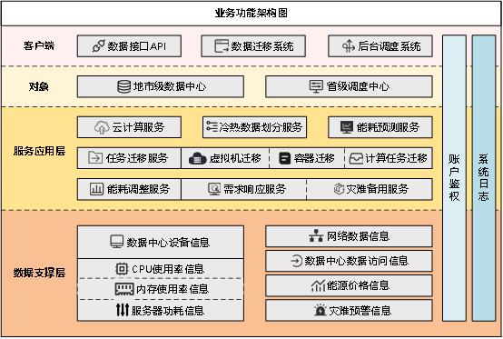 软件业务功能架构如图1所示。业务功能架构由客户端、对象、服务应用层、数据支撑层组成,客户端包含数据接口API、数据迁移系统和后台调度系统。对象为地市级数据中心和省级调度中心。服务应用层包含云计算服务、冷热数据划分服务、能耗数据预测服务、数据迁移服务、能耗调整服务。数据支撑层包含数据中心设备信息、网络数据信息、数据中心数据访问信息、能源价格信息和灾难预警信息。服务应用层和数据支撑层包含平台支撑的服务应用功能以及存储的相关数据。