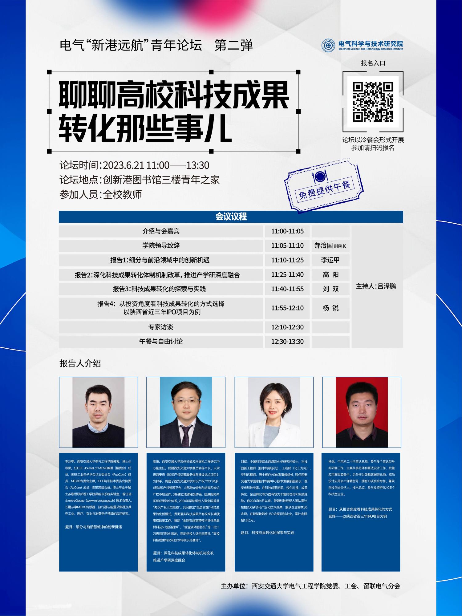 习近平总书记多次强调加速科技成果向现实生产力转化。本次特邀四位资深专家,报告主题涵盖了创新机遇、成果转化体制、成果转化实路、投资角度看转化等方面。无论你是成果丰硕的资深教授,还是初出茅庐的高校萌新,亦或有创业的想法和冲动,相信你定会有所收获!强力充电与美味午餐等您来共享,欢迎各位扫二维码报名参加(注:本次活动仅限教师参加)。