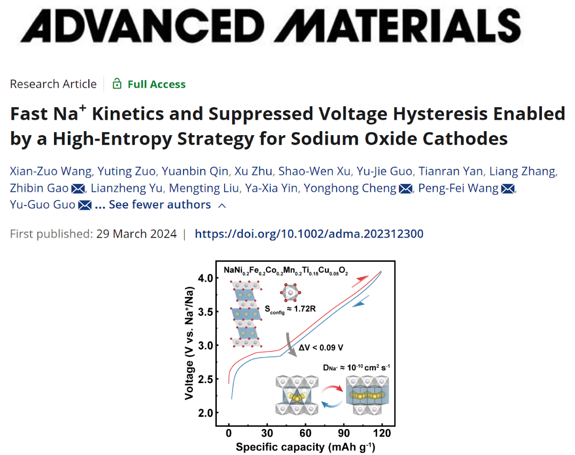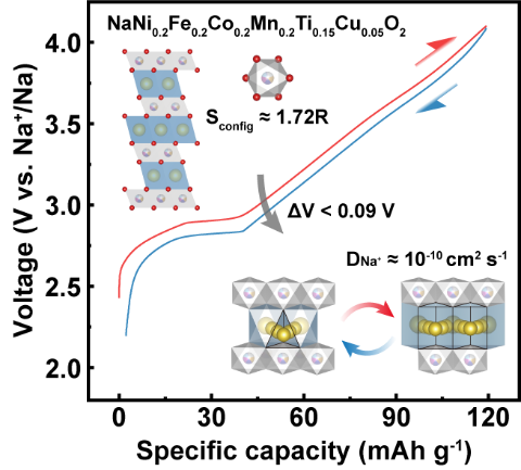 电气学院王鹏飞教授与材料学院高志斌副教授合作,通过“理论模型设计+第一性计算+实验测量与表征”的方法提高过渡金属层的构型熵调控电子结构,缩短了过渡金属层间距,扩展了钠离子的八面体−四面体−八面体传输通道,研制出一种新型钠离子电池高熵正极材料。该正极材料表现出极小的电压滞后(0.09 V),在大电流密度下的倍率性能优异(10 C可逆容量为98.6 mAh g−1),同时具备出色的快充慢放能力。电化学测试结合分子动力学模拟,证实了这种高熵材料有着较低的迁移能垒(0.17 eV),从而提高了Na+扩散系数(~ 10−10cm2s−1)。这项工作强调了对过渡金属进行高熵结构设计的重要性,对于开发高能量密度、高功率的O3型层状氧化物正极材料提供了重要参考。