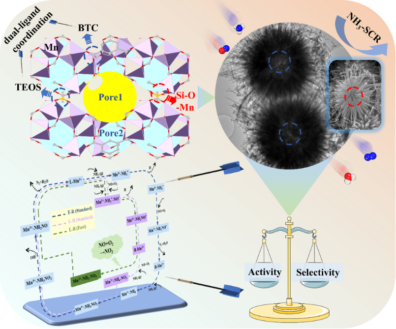 电气学院电力设备电气绝缘国家重点实验室新型储能与能量转换纳米材料研究中心,研制了一种新型脱硝催化剂TEOS&Mn-BTC。该催化剂是具有双配体配位的空心海胆状微球结构,该设计同时调控了催化剂的电子结构和形貌,突破了催化剂脱硝活性和氮气选择性之间的跷跷板效应。双配体在竞争配位过程中会导致催化剂结构中存在更多缺陷,并且产生的内置电场会使电荷重新分布并加速电荷的传输,从而提高脱硝活性。此外,双配体配位导致Si-O-Mn键的生成,增强催化剂的脱硝活性和热稳定性的同时还促进了路易斯酸位点的生成。另一方面,双配体与锰进行层层自组装产生的空心海胆状微球结构大大缩短了传质距离、实现了活性位点的放大、保护了反应中间体、减少了传质损失。在增加活性位点密度、保护中间产物、加快反应速率的同时抑制催化剂氧化性的加强,因此避免了氨的过度氧化,从而提升了催化剂的氮气选择性。该研究突破了脱硝催化剂低温脱硝活性和氮气选择性之间的跷跷板效应,揭示了脱硝活性和氮气选择性同时提升的内在机制,为锰基金属有机骨架材料在脱硝领域的进一步应用提供了新思路。