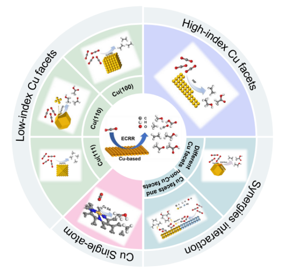 石建稳教授团队围绕这一主题进行了全面综述,综述首先概述了铜基催化剂ECRR的机理和关键影响因素,然后从金属铜催化剂的晶面入手,分别介绍了低指数和高指数晶面暴露情况与其还原产物选择性之间的关系,并总结了暴露不同铜晶面的策略及各自的优缺点。在此基础上,深入探讨了晶面(包括不同铜晶面以及铜与非铜晶面)之间的协同效应对ECRR活性及产物选择性的影响。最后对新型铜基催化剂在CO2还原反应中的应用进行了展望,以期为后续有关铜基电催化剂晶面控制的研究理清脉络并提供有意义的指导。