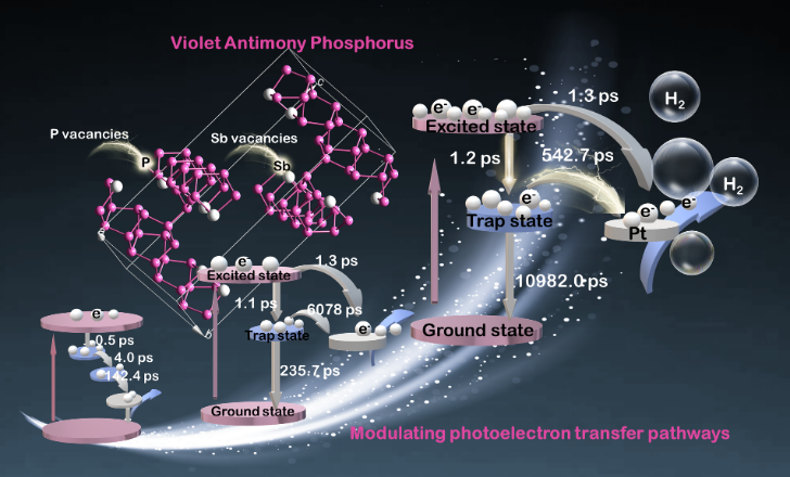 电气学院、电工材料电气绝缘全国重点实验室与北京理工大学和澳大利亚阿德莱德大学利用缺陷工程在紫磷中引入不同缺陷构建浅层陷阱态以改变光电子转移途径,抑制了光生电子-空穴对的重组,显著提高了其光催化性能。通过等离子体处理获得磷和锑空位,在紫磷锑(VPSb)中构建CBM附近的浅陷阱态(VPSb-v)。通过时间分辨吸收光谱发现,空位构建的陷阱态可以使光生电子从陷阱态到助催化剂Pt的衰变时间显著缩短(6892 ps(VPSb)à 542 ps(VPSb-v)),而到基态的衰变时间显著增加(235 ps(VPSb)à 10982 ps (VPSb-v))。研究发现空位引入的陷阱态可作为光生电子的储存库,一部分光生电子可以直接转移到助催化剂上进行催化,而另一部分光生电子先储存到陷阱态而后再转移到助催化剂上进行催化反应。该研究证明了陷阱态的引入可以显著降低光生载流子的复合速率,发现引入陷阱态的VPSb-v的光催化产氢率达到5216μmolg-1h-1,且具有极高的循环稳定性,远高于已有的非金属半导体光催化剂。