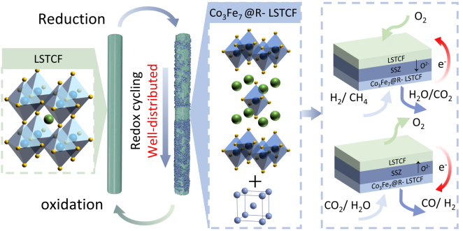 可逆固体氧化物电池(RSOCs)因其高效率、多工作模式和低成本等优点,被认为是新一代的能源转换与存储技术。然而,RSOCs的实际应用仍受限于燃料发电与电解模式切换过程中存在的活性衰减和结构失稳问题。