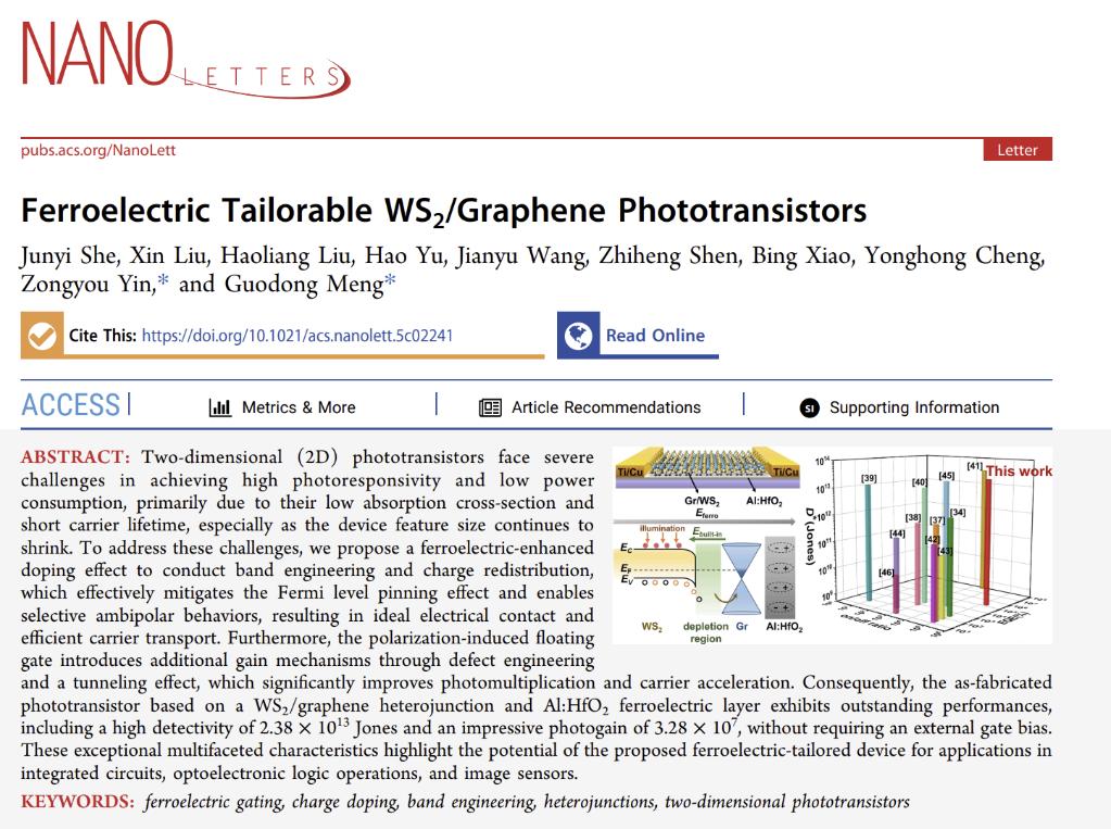 近日,该研究成果以《铁电栅控WS2/石墨烯光电晶体管》(Ferroelectric Tailorable WS2/Graphene Phototransistors)为题在国际知名期刊《纳米快报》(Nano Letters)发表,快看漫画
