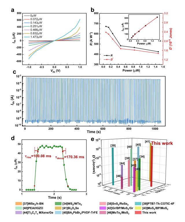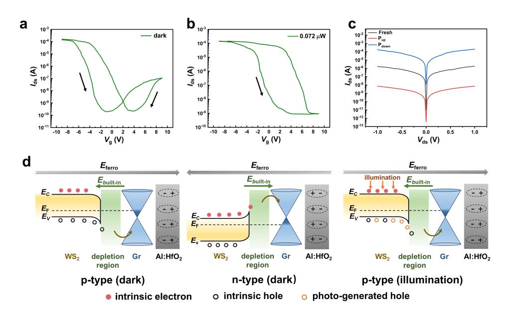 、电工材料电气绝缘全国重点实验室孟国栋教授团队联合澳大利亚国立大学Zongyou Yin教授团队,以铝掺杂氧化铪(Al:HfO2)纳米铁电薄膜作栅介质层,以WS2/石墨烯二维异质结作沟道,制备出新型高性能铁电栅控场效应光电晶体管。首先,利用铁电浮栅引入的缺陷工程以及局域场增强调控的隧穿效应,既延长光生载流子寿命又抑制载流子渡越时间,有效解决了光栅压器件普遍存在的光增益与响应带宽的权衡问题,显著提高了器件的探测效率和响应速度。进一步,通过调控非易失性剩余极化场实现铁电增强的静电掺杂效应,有效抑制费米能级钉扎,达到肖特基-莫特极限接触,提升载流子迁移效率,实现了晶体管选择性的p-型掺杂和双极性运输。设计完成的铁电栅控二维光电晶体管展现了出色的光电响应性能,在零外施栅压下,器件的比探测率和光增益分别高达2.38 × 1013 Jones和 3.28 × 107,与已报道的二维异质结器件相比,其检测信噪比高、响应迅速、运行功耗低,为实现高灵敏、自取能的电力设备状态监测提供了新方案。