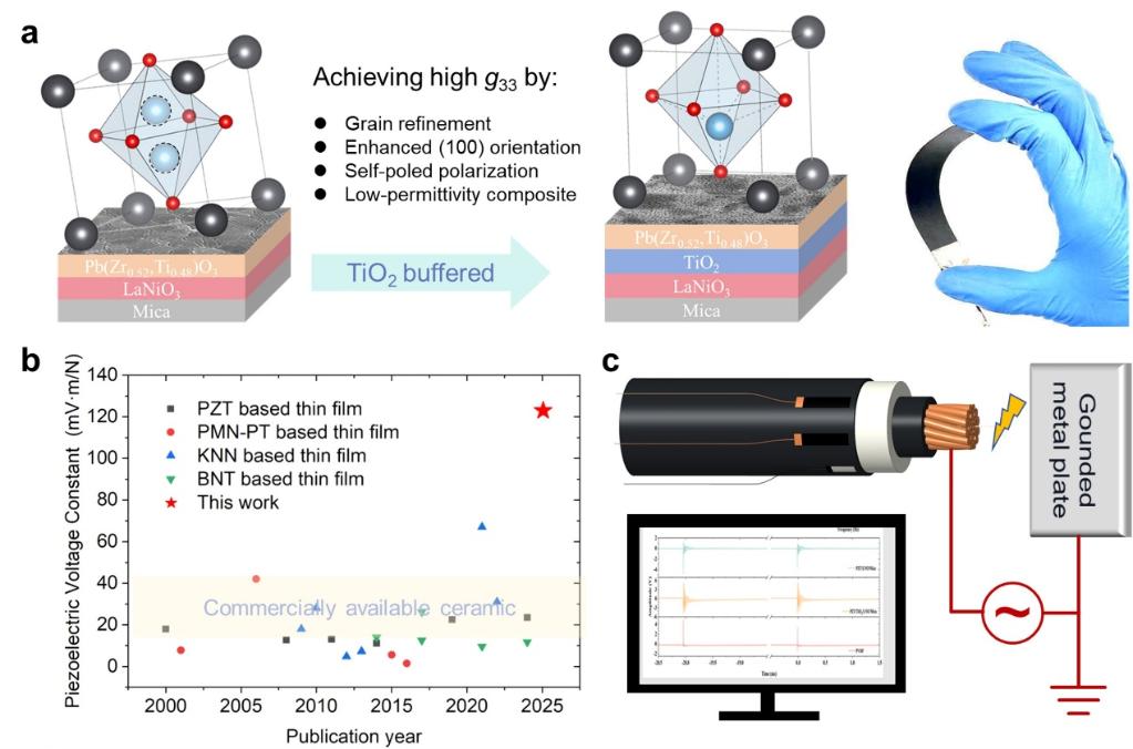 针对这一瓶颈,快看漫画 电气学院钟力生、高景晖教授团队提出了一种柔性压电薄膜的缓冲层调控性能提升策略,通过在Pb(Zr₀.₅₂Ti₀.₄₈)O₃(PZT)薄膜下方引入TiO₂缓冲层:一方面,利用缓冲层的低介电常数降低复合薄膜的等效介电常数;另一方面,通过缓冲层促进PZT晶粒细化、提升择优取向和诱导自极化效应,大幅提升了PZT薄膜的压电系数,实现了柔性压电材料传感性能显著提升。通过该方案获得了压电电压系数高达124 mV·m·N⁻¹的柔性压电薄膜,研制的柔性超声传感器件为电缆局部放电声学检测提供了新型传感解决方案。