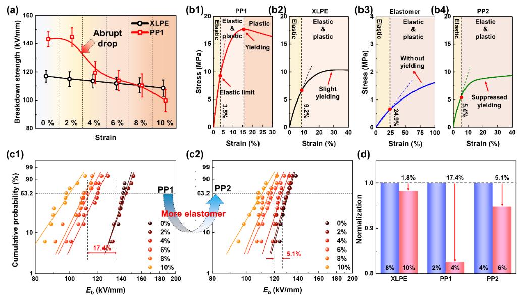 (c1)PP1与(c2)PP2的交流击穿威布尔分布。(d)0-10%拉伸区间下,XLPE与PP绝缘击穿强度发生下降的最大幅度。