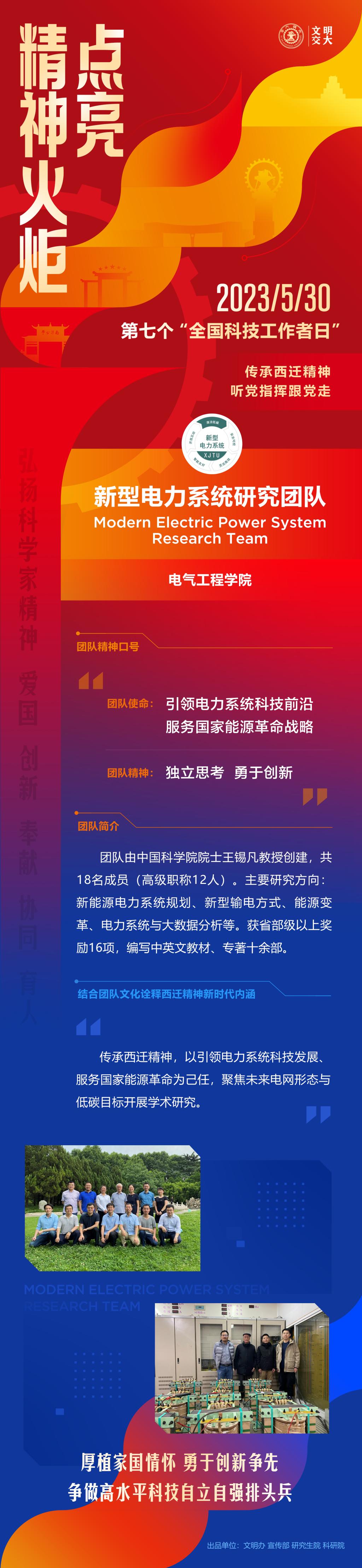 新型电力系统研究团队由中国科学院院士、IEEE Life Fellow王锡凡教授于上世纪80年代创建,已有近40年历史。团队始终以引领电力系统科技发展、服务国家能源革命为己任,理论、实验、实践并重,倡导独立思考、勇于创新,建立了世界上首个分频输电动态模拟技术实验室及国内较早的电力市场仿真实验室,开发了多个版本的电力系统规划软件,不仅为学生搭建了领先的研究平台、提供了广阔的施展空间,还应用于实践支撑了国家能源战略的制定。
