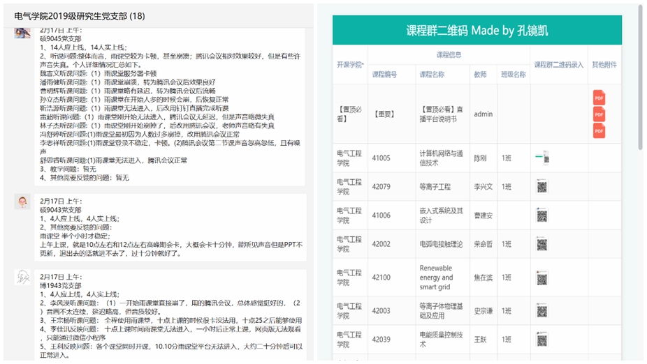 防控新型冠状病毒感染的肺炎疫情工作预案》,做到对学校防控要求心中有数;二是精准掌握班级复学复研情况,做到复学复研不落一人;三是对接同学需求,做到有求能应,有求必应。2月17日复学以来,各支部充分发挥党员联系群众作用,每日进行在线教学效果反馈,目前电气学院春季学期有课学生都已正常上课,教学有序进行。针对线上授课出现的各种问题,硕9048支部孔镜凯成为了学院、老师、教学平台和同学们之间的“联络员”,他利用课余时间熟悉各平台操作方法,开课前一周在学院群里对同学在线指导,并自制课程二维码小程序方便同学查找;针对部分同学在家缺少科研条件及科研资料的情况,各支部积极对接同学需求,联系导师、辅导员及校园物业,将留校科研资料邮寄回家,方便同学居家科研。电气学院各研究生党支部服从学校统一安排,多措并举,保障同学居家学习科研质量。