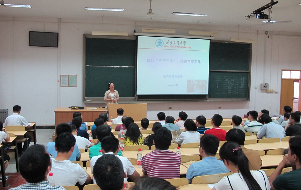 开展“三严三实”专题教育实施方案》的文件精神,分党委书记别朝红讲《践行“三严三实”,推进学院工作》专题党课。别朝红书记带领大家学习了习近平总书记系列重要讲话精神,介绍了 “三严三实”的背景和内涵,要求全体党员干部要树立和发扬好的作风,严以修身,严以用权,严以律已,谋事要实,创业要实,做人要实;要做到“会读、勤研、善听、多做”。通过与国内电气工程学科排名前五的兄弟院校的比较分析,查找了学院工作的差距,提出要立足学院长远发展,将“三严三实”要求贯穿到学院学科建设和人才队伍建设,切实解决思想教育、工作落实和作风建设等方面“不严不实”的问题。