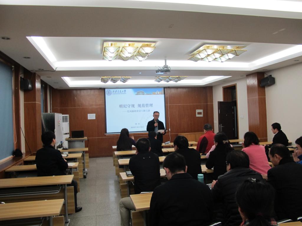 颜莉委员作了题为“明纪守规 规范管理”的党风廉政建设专题报告,介绍了党风廉政建设的形势及背景,列举了高校科研经费、政府采购、基本建设、招生等方面常见的问题,以及典型的腐败案例。为了加强高校财务管理,堵塞漏洞,杜绝腐败,财政部、教育部等相关部门陆续出台一系列强化管理、加强内控的规章制度。学校根据国家及相关部门的要求并结合学校的实际情况,制定出台一系列办法及实施细则,颜莉委员详细解读了学校加强科研经费管理的规定及要求,针对接待费、其他餐费、礼品、车辆运行维护费、交通费、差旅费及出国(境)费用、会议费、测试化验加工及外协费、人员经费发放、设备费、家具费和材料费,以及票据规范性要求、经费支付要求等进行了详细的说明,使大家对学校科研经费的管理办法有了进一步明确的认识。