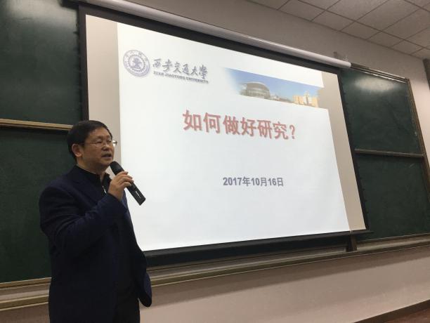 成永红教授指出交大是一流的大学,拥有一流的条件,要做一流的科研。成永红教授讲述了交大的发展历程,指出交大一直拥有国内一流的科研条件和学科实力,是一个真正能静下心来做科研的地方,他以“兔子理论”和“红烧肉理论”形象说明了本科生、硕士生、博士生的不同,建议同学们要学会如何开始做研究,多补充本领域的专业知识,静的下来,要有自学自控能力,懂得分享和互助,相信天道酬勤,留意偶尔闪过脑海的灵感,敢于挑战权威。
