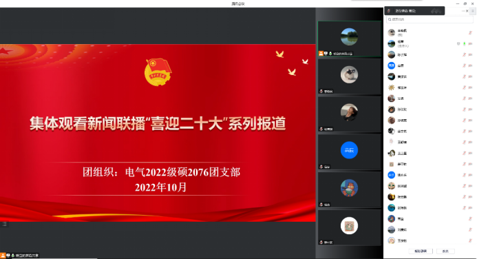 精神领学,继往开来。硕2076团支部邀请南洋书院党总支副书记、辅导员胡可勰老师领学党的二十大报告,解读党的二十大精神。结合”三个务必“,勉励青年人从实际出发,承担青年责任,为建设富强美丽的国家而奋斗。杨章结合党章修正案阐述为什么增写党的百年奋斗重大成就和历史经验的有关内容,同学反响热烈。