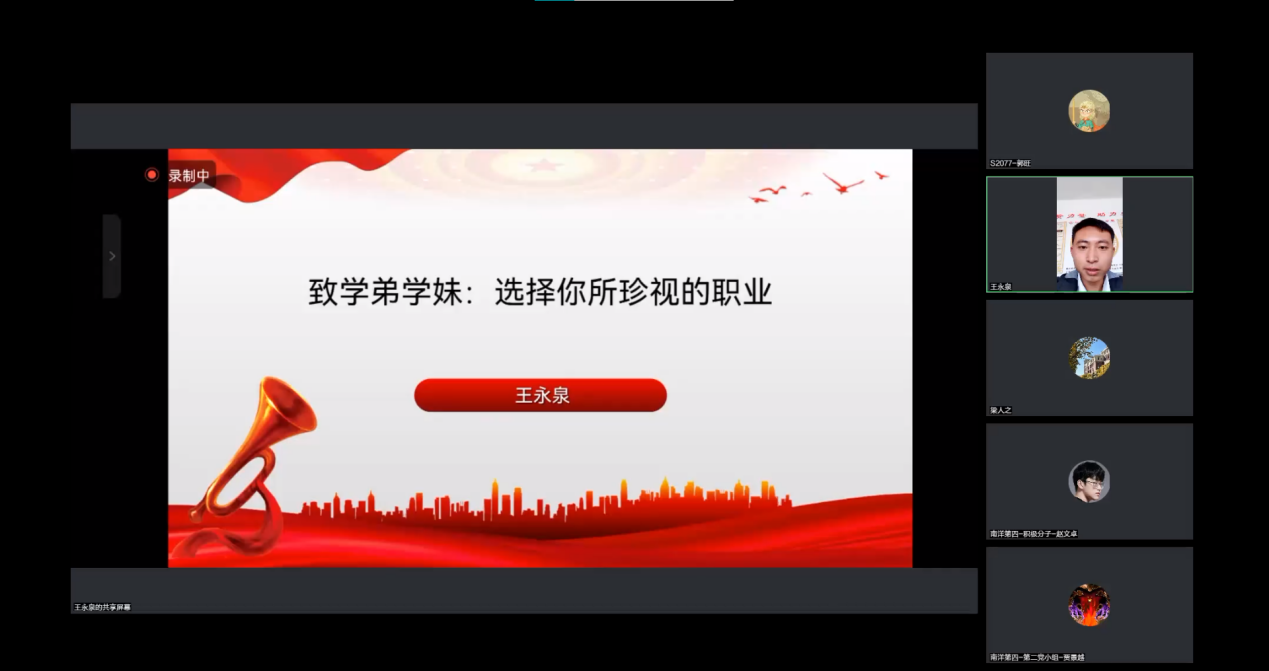 最后,王永泉师兄强调青年人应当心怀“国之大者”。“千头万绪的事说到底是千家万户的事”,选调工作的意义在于踏遍千家万户的门槛,在学中干、在干中学,不辜负党和人民的信任,不负为人民服务的初心使命。在实际工作中理解习近平总书记的话语,体悟其中蕴含的智慧和力量,听党话跟党走,将个人理想融入到党和国家发展中。