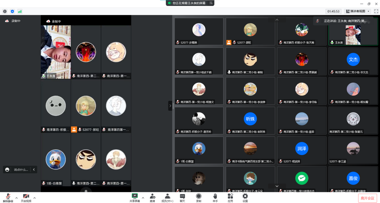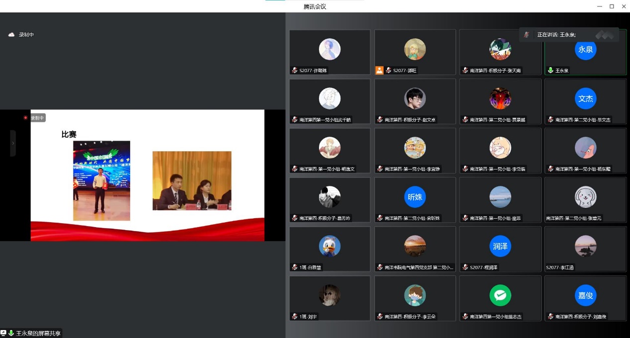 为庆祝党的二十大胜利召开,加强同学们基层服务意识,10月16日下午,电气学院硕2077党团支部与电气学院南洋书院师生联合第四党支部积极响应党委号召,在线上举办了以“学习二十大,建功新时代”为主题的基层建功论坛,邀请第二届“人民公仆”养成行动学员参会。本次论坛聚焦于学习领会党的二十大重要精神,邀请了基层选调生校友王永泉分享基层工作情况与感悟,硕2077党支部书记郭旺同志主持本次论坛。
