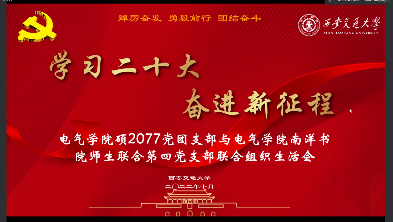 为庆祝党的二十大胜利召开,更好地学习党的二十大精神,10月16日,电气学院硕2077党团支部与电气学院南洋书院师生联合第四党支部联合举办“学习二十大,奋进新征程”组织生活会,电气学院南洋书院师生联合第四党支部指导老师赖函、南洋书院辅导员胡可勰出席会议,硕2077党支部书记郭旺主持会议,两个支部共120余人参加会议。