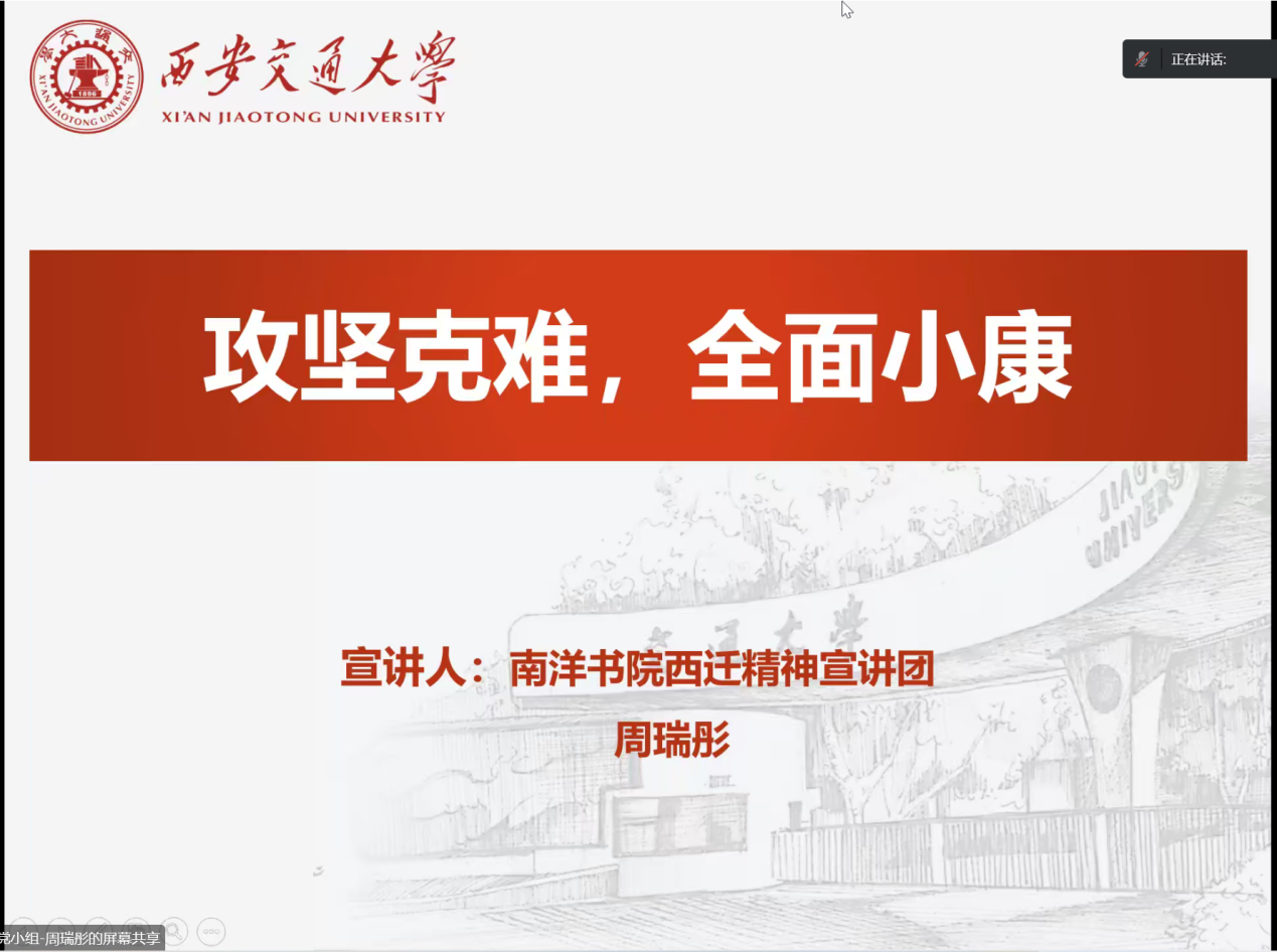 南洋书院西迁精神宣讲团成员周瑞彤作“攻坚克难,全面小康”主题宣讲。宣讲以陕西省宝鸡市陇县段家峡村脱贫致富的故事为例,向同志们介绍党带领人民完成脱贫攻坚、全面建成小康社会的历史任务,她鼓励大家凝心聚力、砥砺奋进,为建成社会主义现代化强国不懈奋斗。