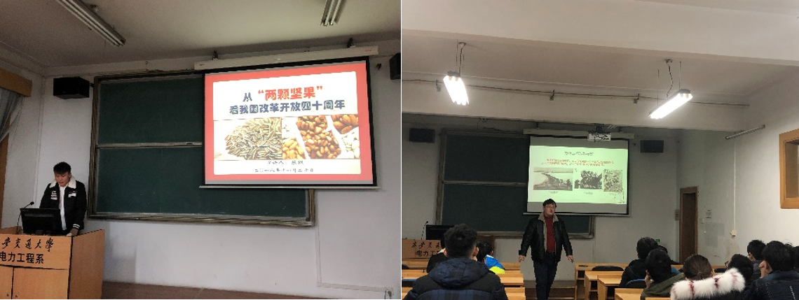 学生筑梦社微宣讲团应邀走进电气学院,面向硕8040、8041、8046、8047党支部的同学们,举办了一场别开生面的改革开放主题宣讲会。宣讲团成员陈枫、刘天洋分别以“从‘两颗坚果’看我国改革开放四十周年”和“为什么要改革开放”为主题,从不同角度对改革开放的历史进行回顾。