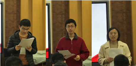 随后会议进行接受预备党员环节。首先,三名发展对象黄玉雄、尤祎祯和殷艳娇分别向党组织汇报了对党的认识、入党动机、本人履历、家庭和主要社会关系情况。随后各发展对象的入党介绍人依次介绍了发展对象的有关情况,并就是否同意发展其入党发表了意见。支部副书记杨青润报告了支部委员会对发展对象的审查情况。支部宣传委员倪绍峰和支部党员石硕分别作为计票人、监票人组织了投票工作,各位党员同志投出了自己宝贵的一票。经过计票,最终大会全票通过了接收三位发展对象为预备党员的决议,全体党员以热烈的掌声见证了这一光荣时刻。