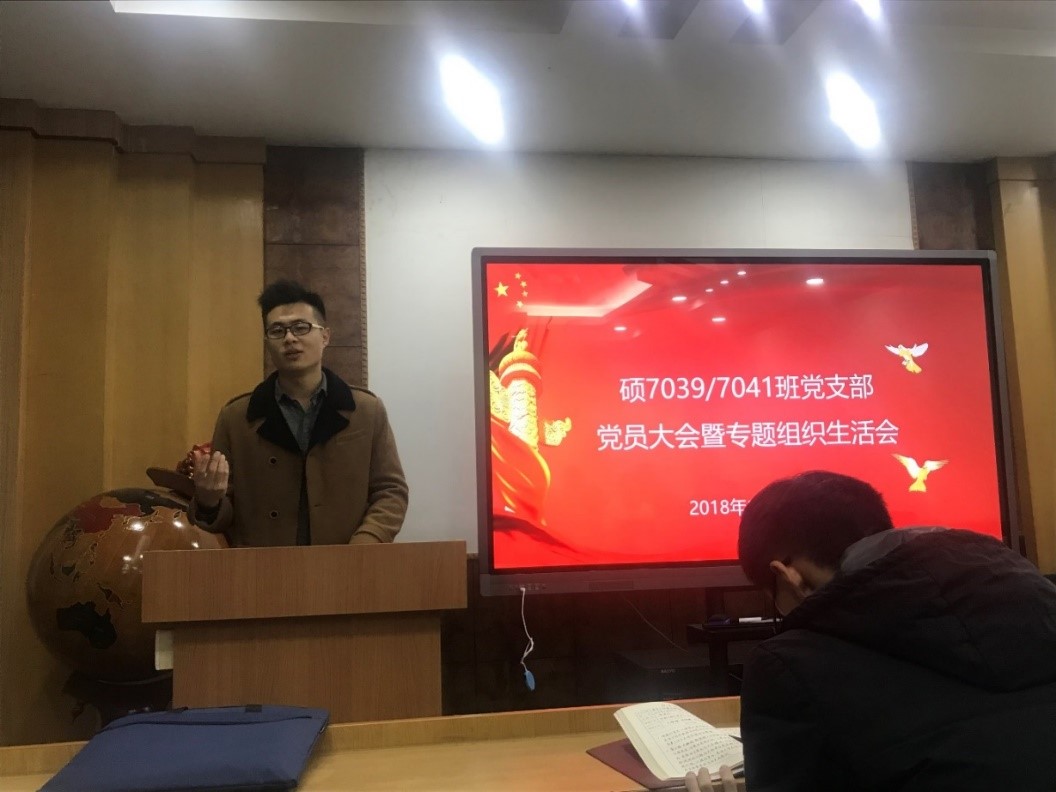 2018年11月26日晚7:00,电气学院硕7039/7041党支部于电力工程系多功能厅召开了党员大会暨专题组织生活会,表决接收三名同志成为预备党员。党支部书记李泽文主持会议。