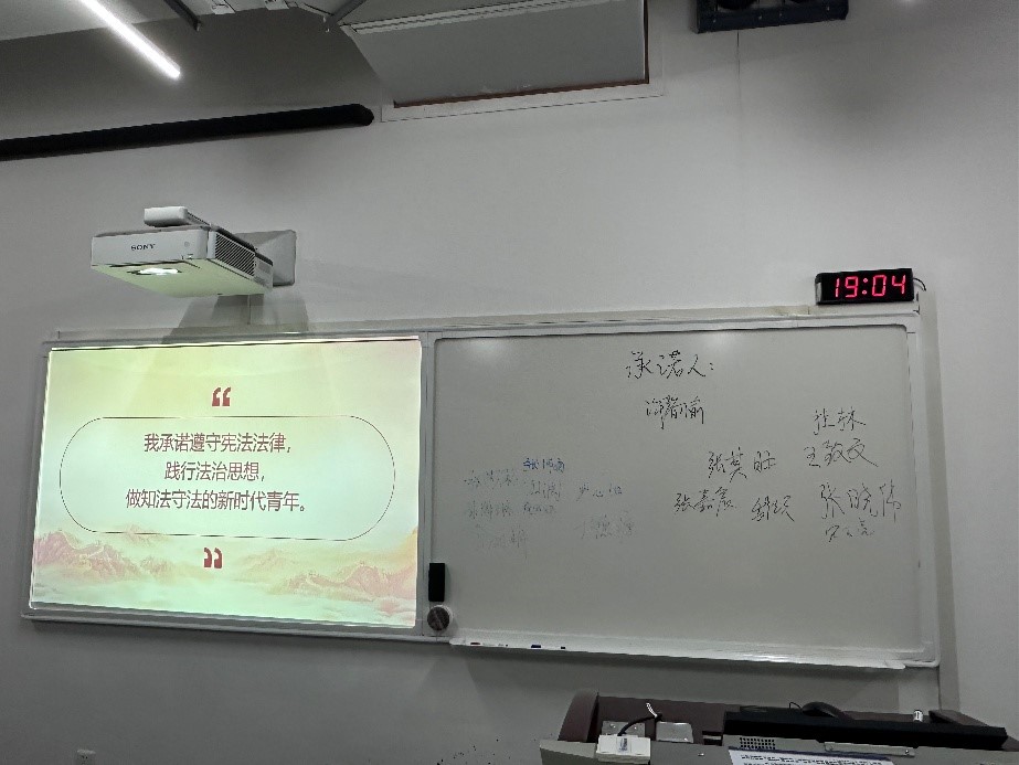 在宪法晨读之后,全体成员郑重地在黑板上签下了自己的名字,这不仅是对宪法的庄严承诺,更是对法治精神的坚定信仰。我们承诺遵守宪法法律,践行法治思想,做知法守法的新时代青年。这份承诺将激励支部各成员在未来的日子里,始终保持对法治的敬畏之心,以实际行动践行法治精神。