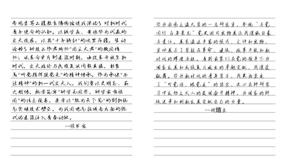 宸徐书表示,参观高等工程教育博物馆使我深化了对新时代青年使命的认知。以钱学森、黄旭华为代表的交大校友,以其“十年铸剑”的攻坚历程,生动诠释了科技工作者胸怀“国之大者”的报国情怀;从革命岁月到建设时期,由改革开放至新时代,交大始终与民族复兴同频共振,彰显着“听党指挥跟党走”的精神传承。作为承继“西迁精神”的新一代交大人,我们当以史明志、薪火相传,既要筑牢“科学无国界,科学家有祖国”的信念根基,更要以“敢为天下先”的创新锐气突破技术壁垒,为我国电气领域各方面的现代化建设注入青春动能。