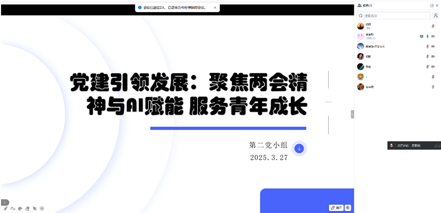 电气学院S3063党支部第二党小组在线上召开党小组会议,围绕“聚焦两会精神与AI赋能,服务青年成长”主题展开学习讨论。会议由第二党小组组长史家驹主持,小组全员参会。