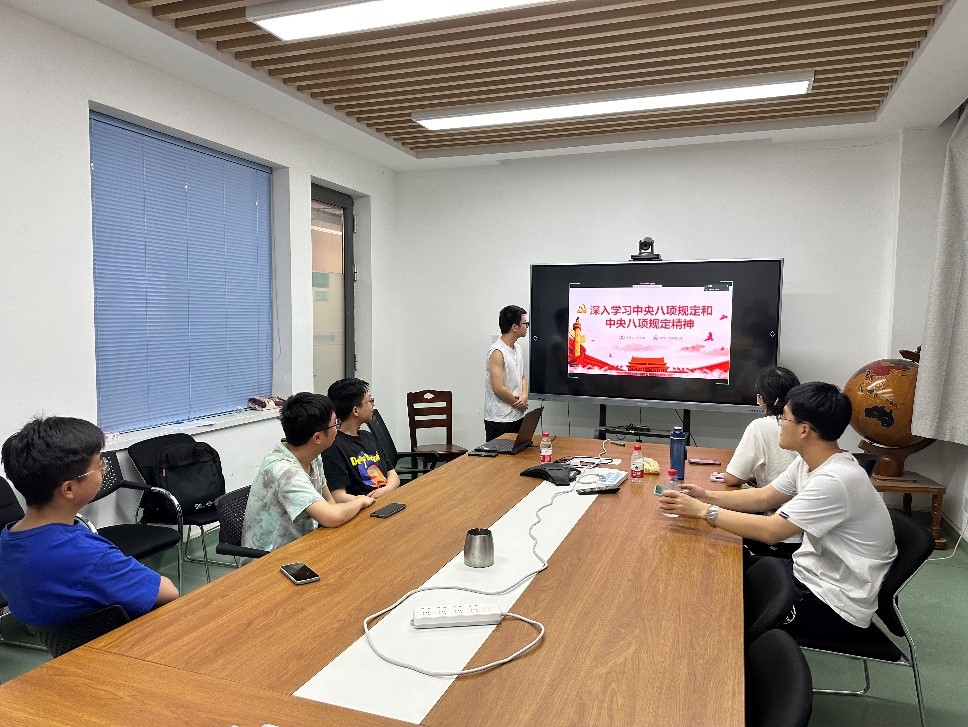 会议首先传达了《关于在全党开展深入贯彻中央八项规定精神学习教育的通知》的主要内容。卢泓睿同志强调,中央八项规定具体条文主要是对中央政治局提出的要求,但是中央八项规定精神是对全党同志的共同要求,中央八项规定精神的核心是反对形式主义、官僚主义、享乐主义和奢靡之风。全体党员要深刻领会其内涵,结合自身实际,查找问题,改进作风。大家一致认为,中央八项规定精神是新时代加强党的作风建设的重要遵循,是密切党同人民群众血肉联系的关键举措。在讨论环节,党员们结合自身工作和生活实际,分享了对中央八项规定精神的理解和感悟。甘润澄同志认为在日常工作中,要注重务实高效,避免形式主义,提高工作效率,科研工作应以解决实际问题为导向,注重科研成果的质量和实际应用价值;沈文韬同志认为应保持对科研的热情和执着,不畏艰难,勇于挑战,在科研过程中,要树立正确的价值观,将个人的成长与国家和社会的需求结合起来,以解决实际问题为己任,而不是单纯追求个人的享乐和利益。