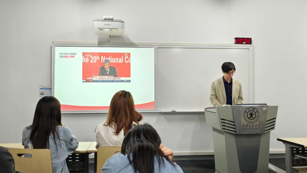 会上,马瑞祺同学以“明纪铸魂 力行致远”为主题作专题演讲。他详细阐述了中央八项规定的历史意义与长期性,深入解读了其核心内容、精神实质及针对的现实问题。马瑞祺指出,中央八项规定是全面从严治党的重要举措,其破局之举取得了显著成效,必须长期坚持。他还结合实际,分析了贯彻落实八项规定的实践路径,号召同学们严于律己,以实际行动践行规定精神。