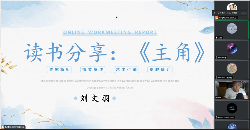 随后,刘文羽同学带来《主角》的主题分享。在分享中,刘同学强调了《主角》的精神内涵,即每个人都是自己生活中的主角,奋斗的道路虽充满艰辛,但坚持和努力最终会带来回报。她的讲述不仅让同学们对秦腔这一传统艺术有了更深入的了解,也激发了大家对自我奋斗和成长的思考。通过这次读书分享,同学们不仅仅是学习了书中的内容,还在思考如何在自己的人生舞台上成为“主角”。