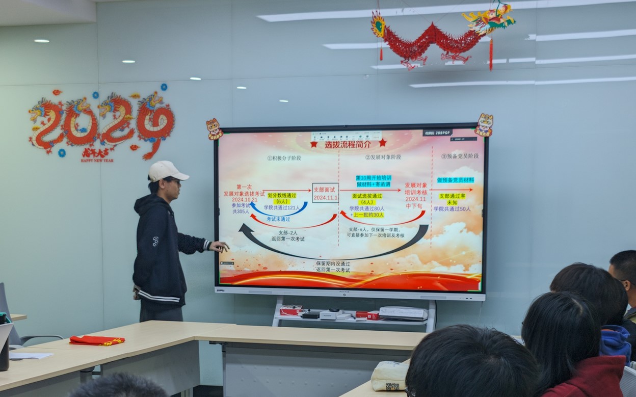 为深入落实新时代党的建设总要求,严格把控党员发展“质量关”,提高党员发展质量,硕3066党支部于11月1日晚在3-3155会议室召开了2024秋季发展对象选拔大会。硕3066党支部全体成员参加大会,会议由支部书记孟雨晨同志主持。